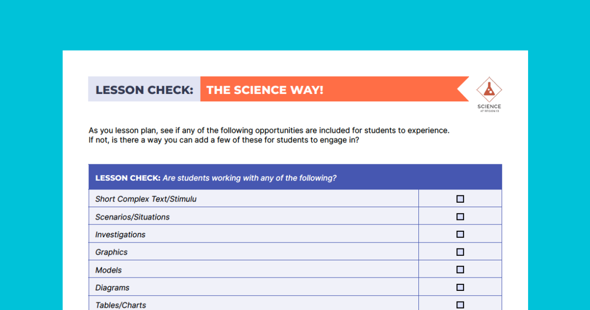 Bring deeper thinking to your science lessons with this quick reflection tool. Use the Lesson Check: The Science Way! to see if your plans include opportunities for students to investigate, model, analyze, and make connections between scientific ideas.