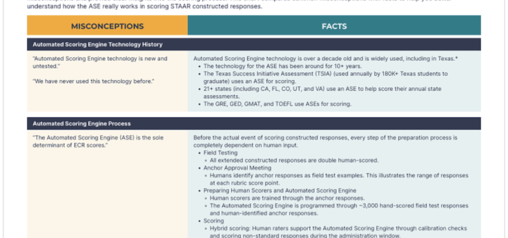 Sorting Misconceptions vs. Reality for STAAR Automated Scoring The Texas Education Agency’s (TEA) announcement regarding the use of an Automated Scoring Engine (ASE) to score constructed response items on STAAR assessments has created many questions. Maybe you’ve heard about the ASE but aren’t sure what to make of it. Or, you are questioning how automated […]