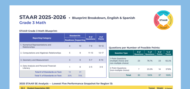 These Blueprint Breakdowns provide insight into the construction of STAAR tests. Each Breakdown lists the number of questions, possible points, number of assessed standards, and a student expectation performance snapshot from the 2025 STAAR test results. Math